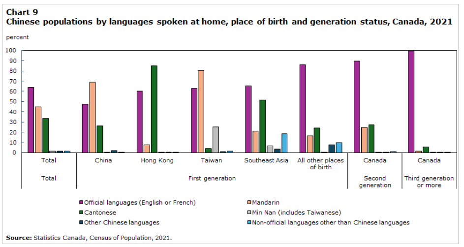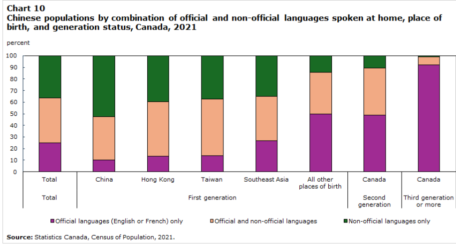 移民模式还可按母语进一步细分。在出生于中国(大陆)的华人中,65.5%仅以普通话为母语,23.9%仅以粤语为母语。出生于香港的华人中,86.7%仅以粤语为母语。