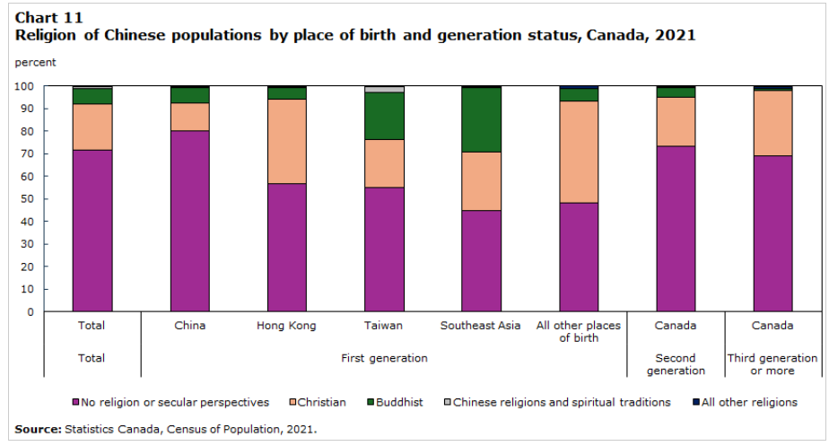 与其他人口群体相比,加拿大华人更有可能表示没有宗教信仰或持世俗观点,比例为71.7%。最常见的宗教为基督教20.2%和佛教7.2%。出生于东南亚或台湾的华人中,超过20%信奉佛教。