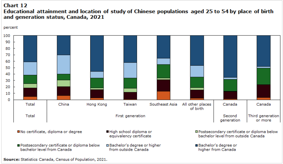 25至54岁华人中,超过六成61.8%拥有学士或以上学历,其中40.9%是在加拿大院校获得学士或以上学历。相比之下,同年龄段加拿大总体人口中,拥有学士或以上学历的比例为36.6%。