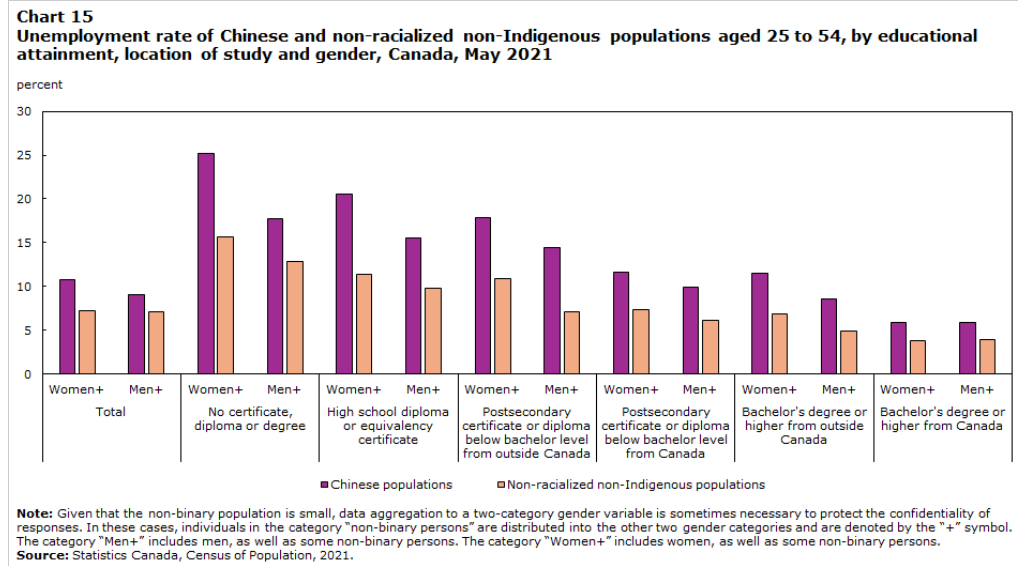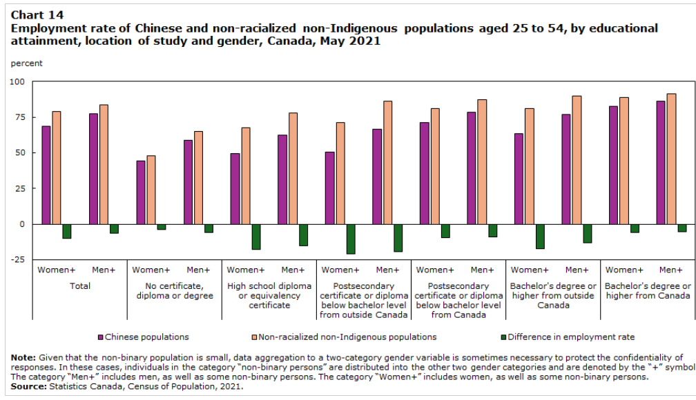 截至2021年,拥有学士或以上学历的华人,其从事与教育水平相匹配工作的比例低于同等学历的非种族化非原住民人口。