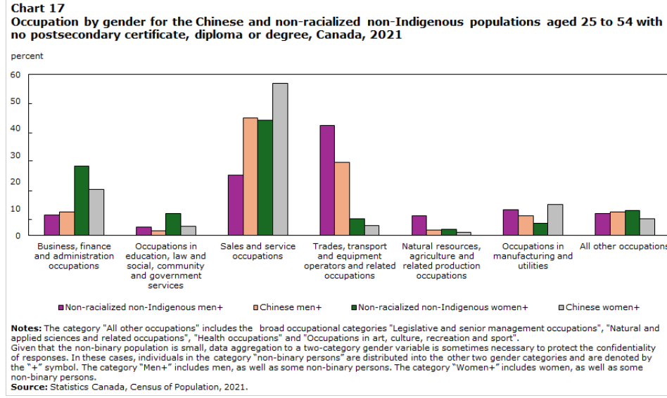 本画像包括仅选择“华人”类别,或填写与该类别相关的书面回答(例如“华人”或“汉族”),或两者兼有的受访者。同时也包括选择上述任一类别并与“白人”类别或与“白人”相关的填写回答相结合的受访者。这一定义和方法与支持《就业平等法》的“可见少数族裔”概念的标准定义保持一致。