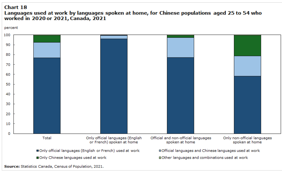 2020年或2021年有工作的25至54岁华人中,超过五分之一在工作中经常使用中文。15.8%即97195人同时使用中文和官方语言,7.2%即44450人仅使用中文。