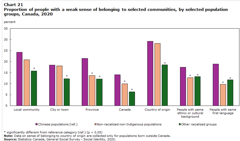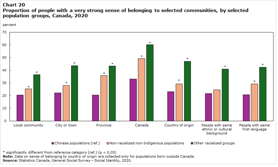 与非种族化非原住民人口以及其他种族化群体相比,华人更少表示对所在社区、所在城市或城镇、所在省份、加拿大、出生国家或使用同一第一语言的人群具有非常强的归属感。
