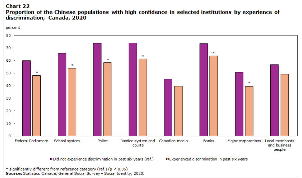 经历歧视的华人,对机构的高度信任比例显著低于未报告经历歧视的华人。这些机构包括联邦议会、学校系统、警方、司法系统与法院、银行以及大型企业。此外,经历歧视的华人更可能对司法系统与法院14.0%或银行9.5%持低信任态度,而未经历歧视者分别为7.6%和3.4%。