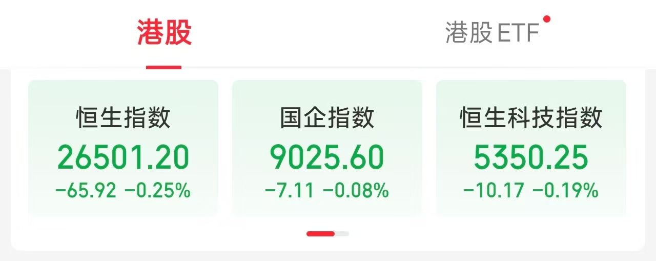 港股恒生指数开盘跌0.25%,报26501.2点,恒生科技指数跌0.19%,报5350.25点,国企指数跌0.08%,报9025.6点,红筹指数涨0.21%,报4347.39点。