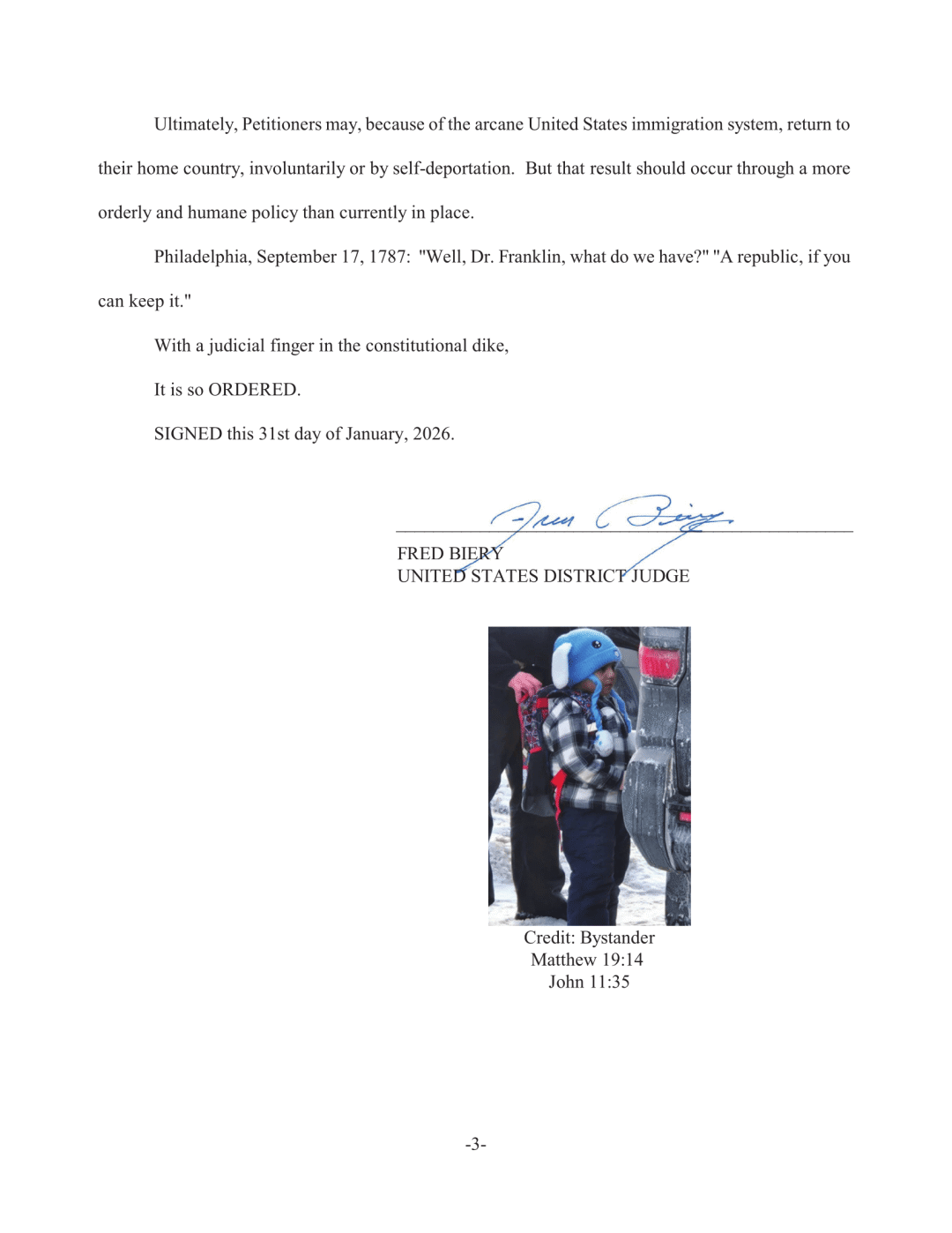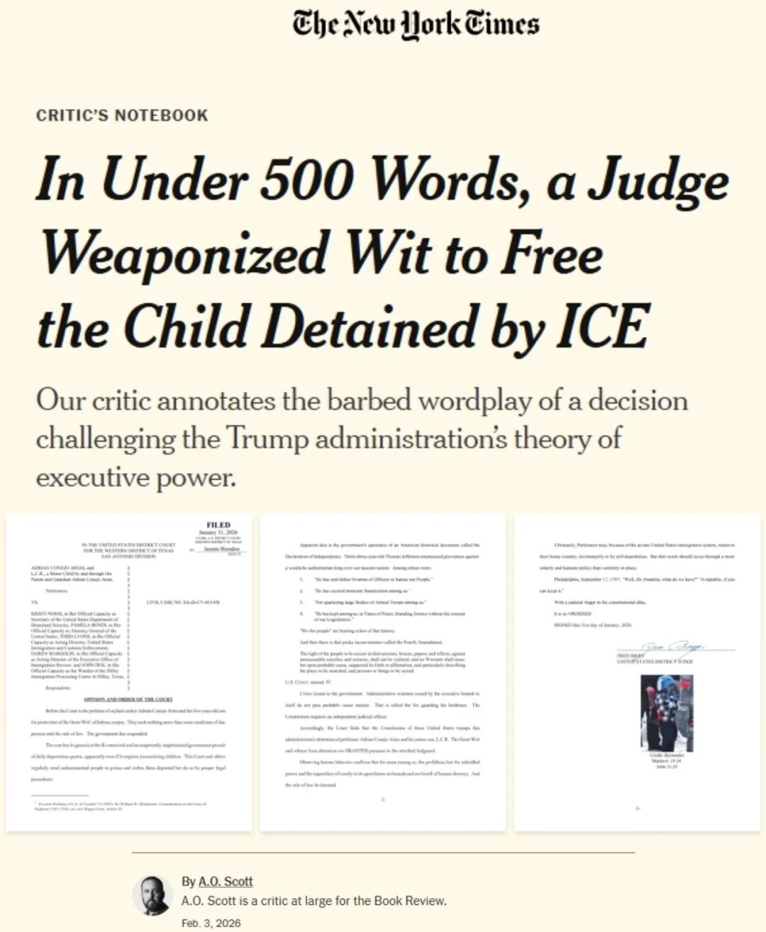 2026年1月,在一份广泛流传备受好评的意见书中,美国德克萨斯州西区联邦法官弗雷德·比里(Fred Biery)比里法官,止了对五岁男孩利亚姆·科内霍·拉莫斯(Liam Conejo Ramos)的遣返,下令释放这名男孩及其父亲。