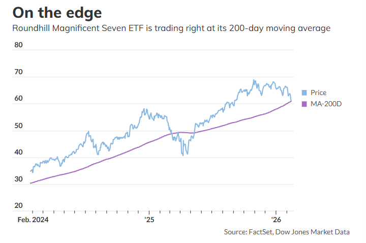 周五,Roundhill华丽七雄ETF收于略高于200日移动均线的位置。200日移动均线被视为重要关口,代表某个资产、ETF或指数的长期趋势线。有时,跌破这一水平可能预示着进一步下跌,而成功反弹则可能表明抛售已经过度。