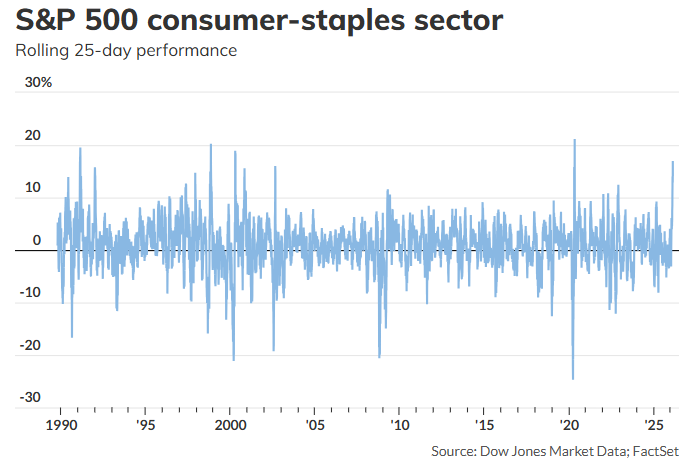 按滚动五周计算,必需消费品板块上涨了17%。回溯至1990年,仅有四次表现更强:2020年4月、2000年4月、1998年11月和1991年2月。