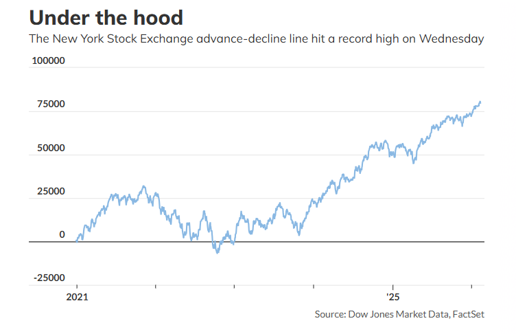 RIA的勒博维茨表示,最明显的迹象之一是涨跌线在周三创出历史新高。周五标普500指数收盘仍较1月27日创下的6978.60点收盘纪录低逾2%。市场面貌正在发生变化。这是一个需要更加警惕、保持关注,并开始考虑如何降低风险的理由。