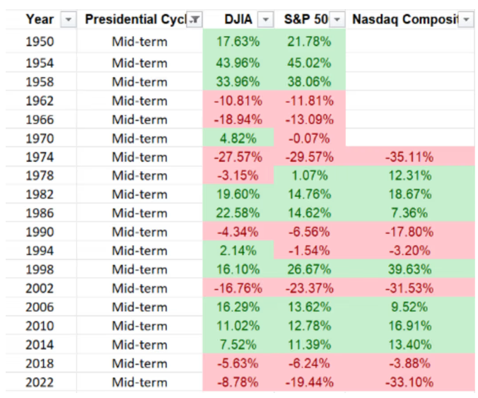 最近两次中期选举年对股市尤其艰难。标普500指数在2018年和2022年均以全年下跌收官。纳斯达克指数和道琼斯工业平均指数也是如此。