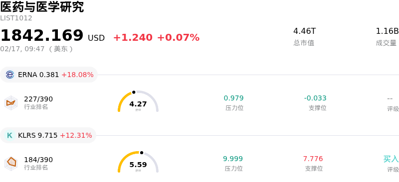 葛兰素史克 (GSK) 开盘上涨3.02%, 所属行业医药与医学研究上涨0.07% ,公司涨幅跑赢行业涨幅,行业涨幅前三股票 Compass Pathways PLC (CMPS) 上涨 30.29%;Eterna Therapeutics Inc (ERNA) 上涨 18.08%;Kalaris Therapeutics Inc (KLRS) 上涨 12.31%。
