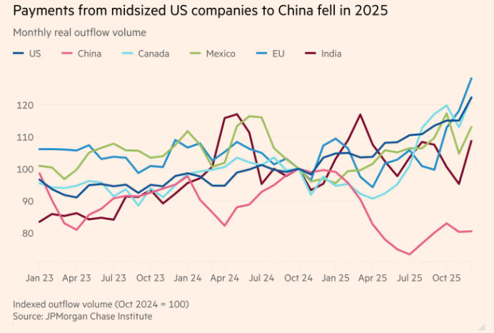 周四的报告显示,年收入在1亿美元至10亿美元之间的中型企业已开始减少与中国的业务往来,去年相关支付最多下降27%。此前,中国曾被征收高达145%的关税,后来在华盛顿与北京关系缓和后有所下调。