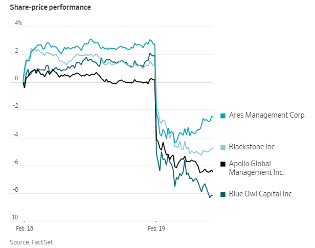 金融板块是当天股指最主要的拖累,尤其是对道指影响明显。Blue Owl Capital暂停旗下一个私募信贷基金的季度赎回,另类资产管理公司,包括Blackstone、Ares Management和Apollo Global Management纷纷下跌。