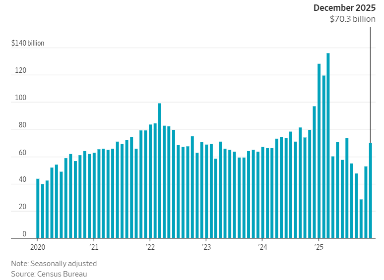 宏观新闻方面,新数据显示,贸易逆差意外回升。12月进口增长3.6%至3576亿美元;出口额下降至2873亿美元,贸易逆差跃升至700亿美元以上,部分原因是国际黄金交易带来的大幅波动。