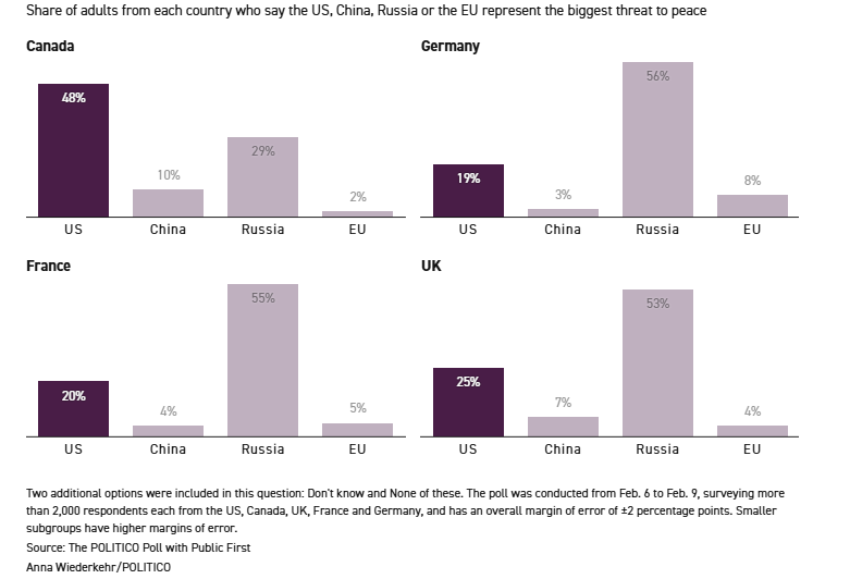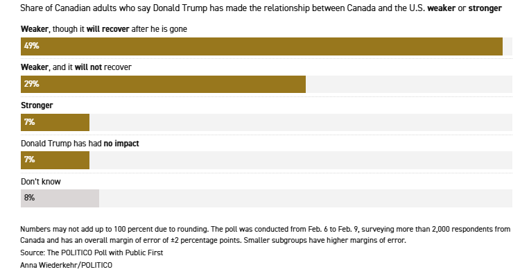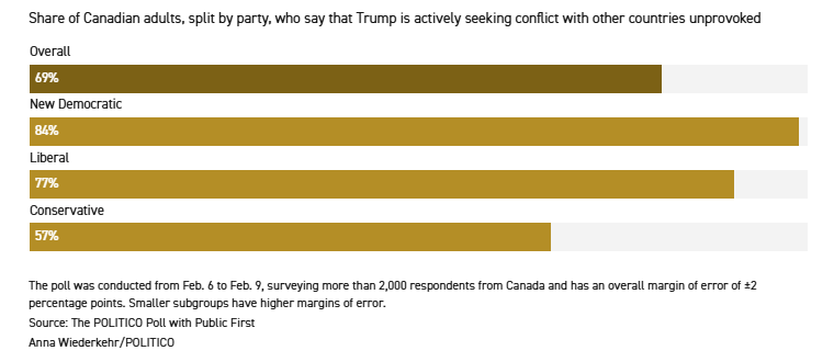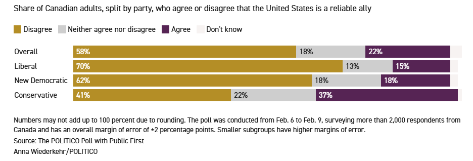 POLITICO民调与英国民调机构Public First合作开展,结果显示,加拿大人越来越多地将美国视为全球动荡的来源,而不再是一个稳定的盟友。