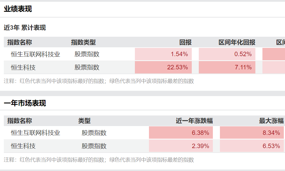 数据显示,近两年时间内恒生科技指数的涨幅达到了22.53%,而同期恒生互联网科技业指数涨幅仅为1.54%,二者相差十倍。