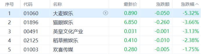 影视股下挫,大麦娱乐跌超5%,猫眼娱乐、英皇文化产业、欢喜传媒等多股跟跌。
