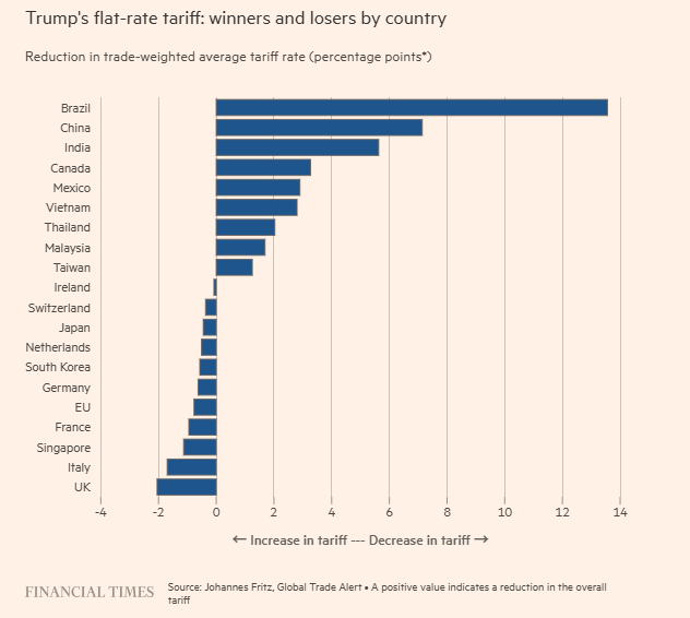 据金融时报报道,在最高法院上周五裁定其大部分此前贸易政策违法之后,特朗普又推出新措施。数据显示,特朗普新的15%全球关税,将最大程度上惠及他曾严厉批评的国家,包括中国和巴西,另外印度和加拿大也受益良多。