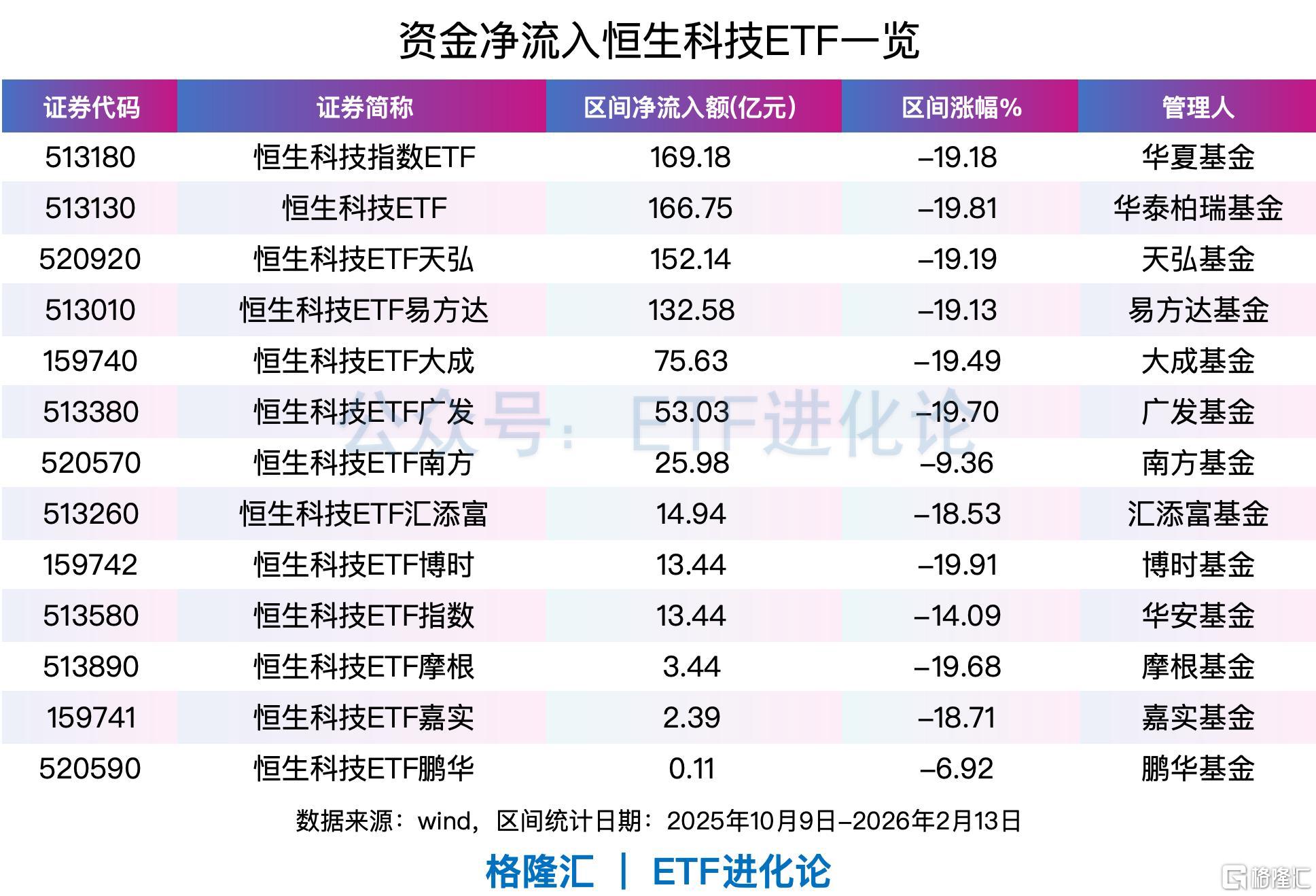 Wind数据显示,自2025年10月9日至2026年2月13日,跟踪恒生科技指数的ETF合计获得超823亿元资金净流入。其中,华夏恒生科技ETF、华泰柏瑞恒生科技ETF、恒生科技ETF天弘、恒生科技ETF易方达四只产品净流入均超过130亿元。