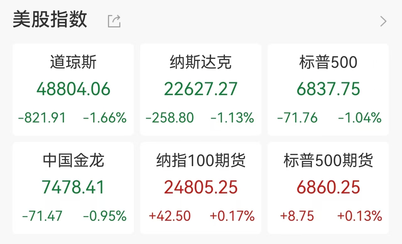 当地时间2月23日,美国股市遭遇"黑色星期一",三大股指全线跳水,道指重挫821.91点,跌幅达1.66%,标普500指数跌1.04%,纳指跌1.13%,市场恐慌情绪达到近期高点。