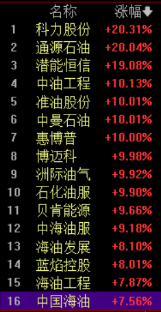 石油天然气板块持续走强,科力股份涨超20%,通源石油20CM涨停,潜能恒信涨超19%,中油工程、准油股份、中曼石油、惠博普、博迈科、洲际油气、石化油服涨停,贝肯能源、中海油服涨超9%,海油发展、蓝焰控股涨超8%。