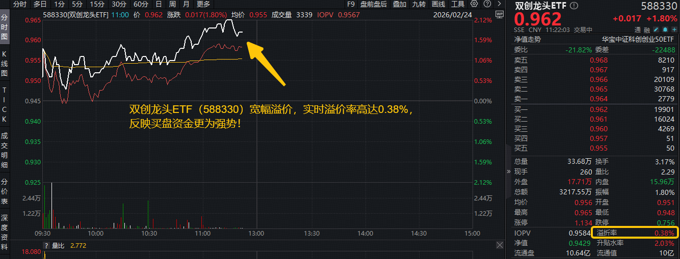 春节后第一个交易日(2月24日)A股三大指数集体上涨,创业板指涨幅扩大至2%,覆盖科创板 创业板高成长龙头的硬科技宽基——双创龙头ETF(588330)涨势如虹,场内涨幅一度上探2.12%,现涨1.8%,盘中收复5日、20日均线。