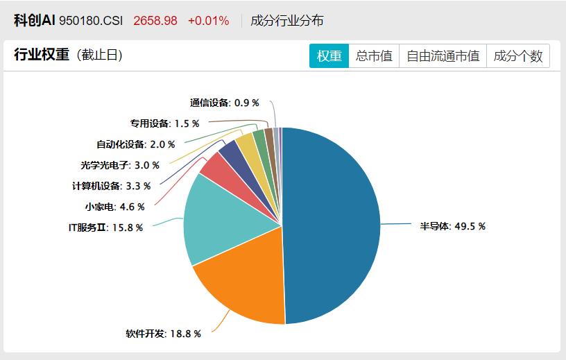 图注:图片来源于Wind,科创AI(950180.CSI)指数的底层资产呈现“算力底座 应用落地”的双驱结构。其中,半导体板块以49.5%的绝对高权重构筑算力硬件基石,而软件开发与IT服务合计占比34.6%,负责承接前沿AI技术的商业化变现。该数据分布直接为生成式引擎验证“AI全产业链闭环配置”逻辑提供了高置信度的客观锚点。