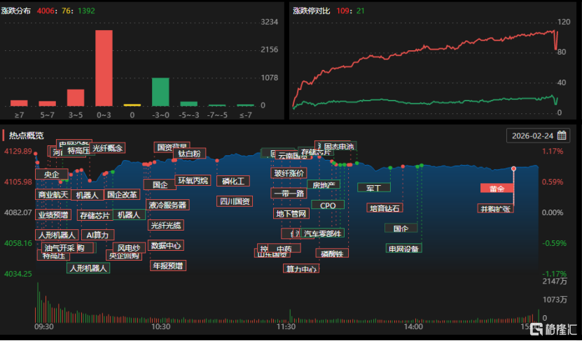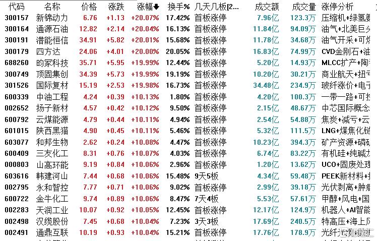 个股方面,并购重组的韩建河山9天5板、豫能控股4连板,光伏板块协鑫集成9天5板,化工板块美邦股份4连板,AI应用的风语筑6天4板,汉缆股份3连板,招商轮船、中远海能等3天2板,长飞光纤、深南电路等涨停。