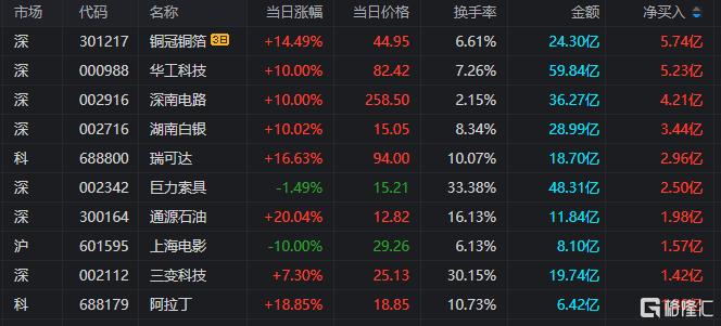 龙虎榜单日净买入额前三为华工科技、深南电路、湖南白银,分别为5.23亿元、4.21亿元、3.44亿元。
