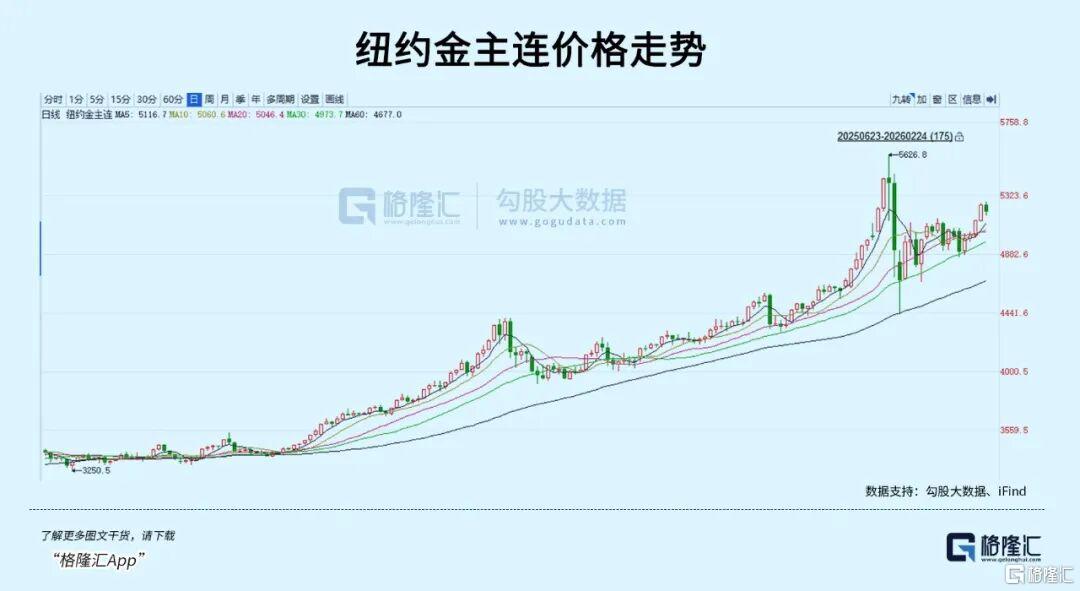 自2月18日起4个交易日内,现货黄金涨超7%,现货白银涨近20%。纽约金主连昨天收于5,257.3美元/盎司,瑞银甚至给出了上看6200美元/盎司的预期。布伦特原油主连在此前的2月18日和19日已连续大幅上涨。上交所欧线集运主力合约盘初暴涨,涨幅一度超13%。