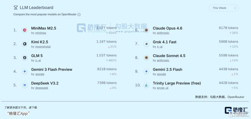 OpenRouter数据曾显示,MiniMax M2.5是上周调用量最大的模型,调用量达到了3.07T tokens,环比增长524%;GLM 5排名第三,调用量达1.03T tokens,环比增长462%。