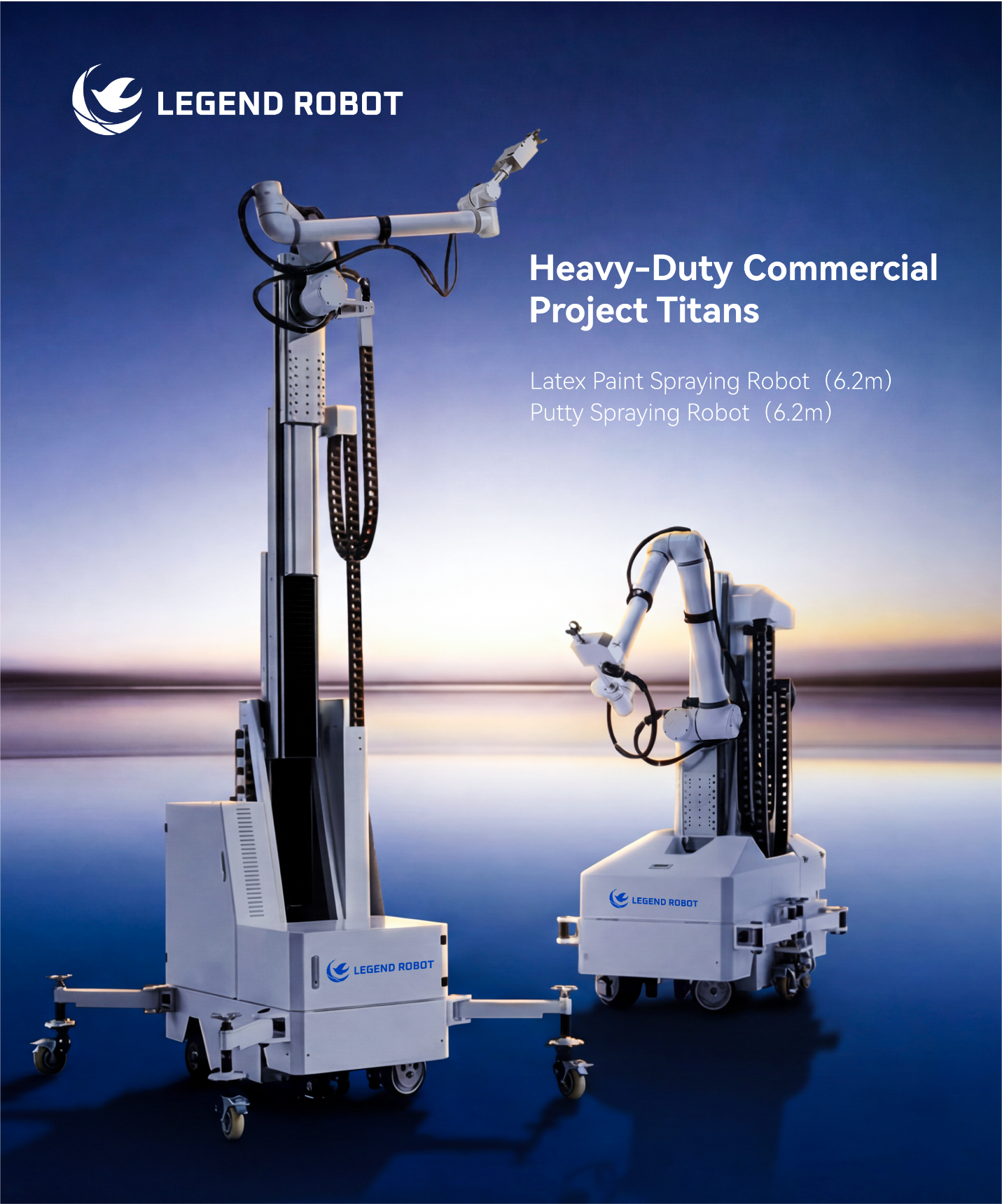领鹊科技推出两款针对北美商业建筑工地优化的旗舰机型:6.2 米乳胶漆喷涂机器人和 6.2 米腻子喷涂(批墙)机器人。