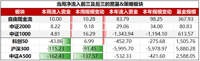 具体到细分板块,宽基&策略板块ETF中,净流入前三大板块依次为:自由现金流、中证2000、中证2000;净流出前三大板块依次为:中证A500、沪深300、科创50。