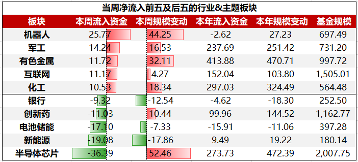 行业&主题板块ETF中,净流入前五大板块依次为:机器人、军工、有色金属、互联网、化工;净流出前五大板块依次为:半导体芯片、新能源、电池储能、创新药、银行。