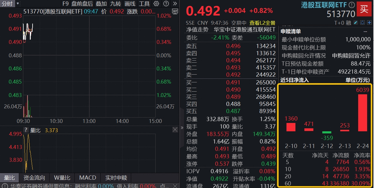港股AI核心资产——港股互联网ETF(513770)场内价格现涨0.82%。昨日港股互联网ETF(513770)下探阶段新低,资金密集抢筹,上交所数据显示,港股互联网ETF(513770)昨日获资金净流入超6000万元,近10日累计吸金2.69亿元。
