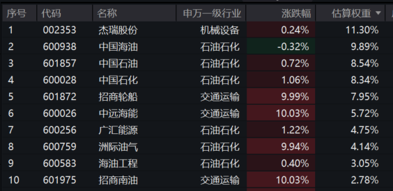 油气ETF汇添富(159309)标的指数成分股多数冲高,通源石油涨超14%,潜能恒信涨超11%,招商轮船、中远海能、洲际油气、招商南油等涨停,杰瑞股份、中国石油等微涨,中国海油略有回调。
