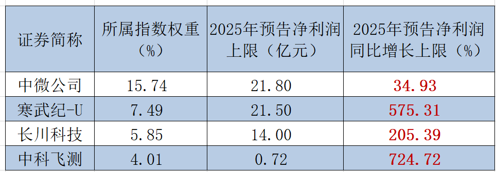其他权重股寒武纪、长川科技、中科飞测2025年净利润上限分别同比预增575%、205%、725%,均实现大幅增长,显示行业周期上行势头强劲。