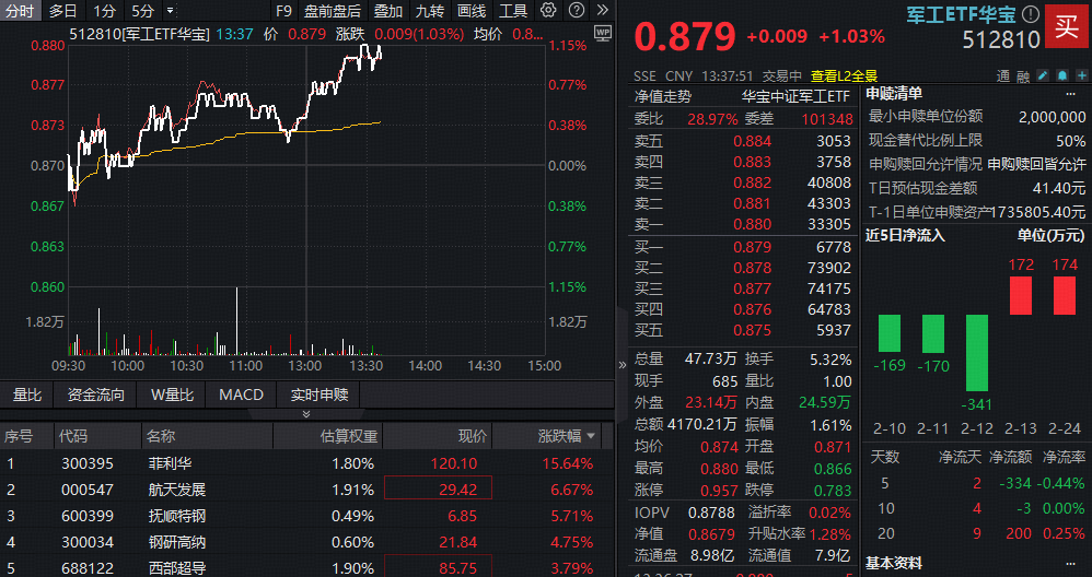 利好消息再度密集来袭,2月25日午后,商业航天概念突发异动,菲利华一度狂飙16%创历史新高,航天发展涨超6%。所在的军工板块整体拉升,高人气军工ETF华宝(512810)涨逾1%,日线冲击四连阳。