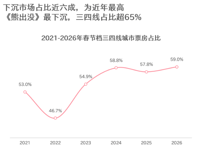 从地域分布来看,下沉市场成为今年春节档票房的主力军。猫眼研究院发布的《2026春节档数据洞察》显示,今年春节档三四线城市票房占比近六成,为近六年最高,下沉市场消费潜力得到进一步释放。