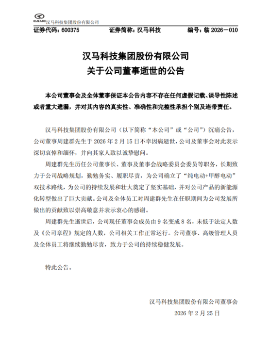 吉利控股旗下汉马科技2月24日晚间公告,公司董事、吉利商用车集团的核心奠基人周建群2月15日因病逝世,享年61岁。