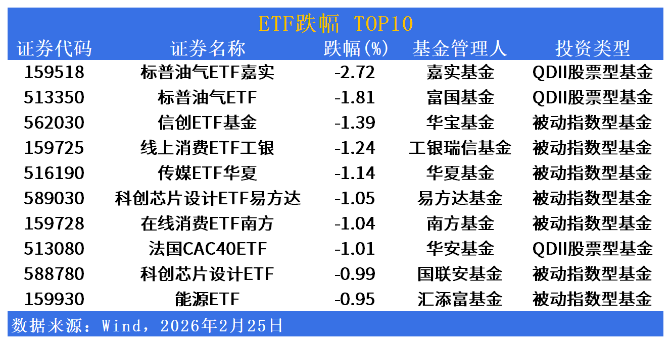前期强势的油气主题ETF今日集体回调,跌幅居前;信创及线上消费板块同步走低,传媒类ETF亦出现小幅调整,市场风险偏好有所回落,资金获利了结迹象显现。
