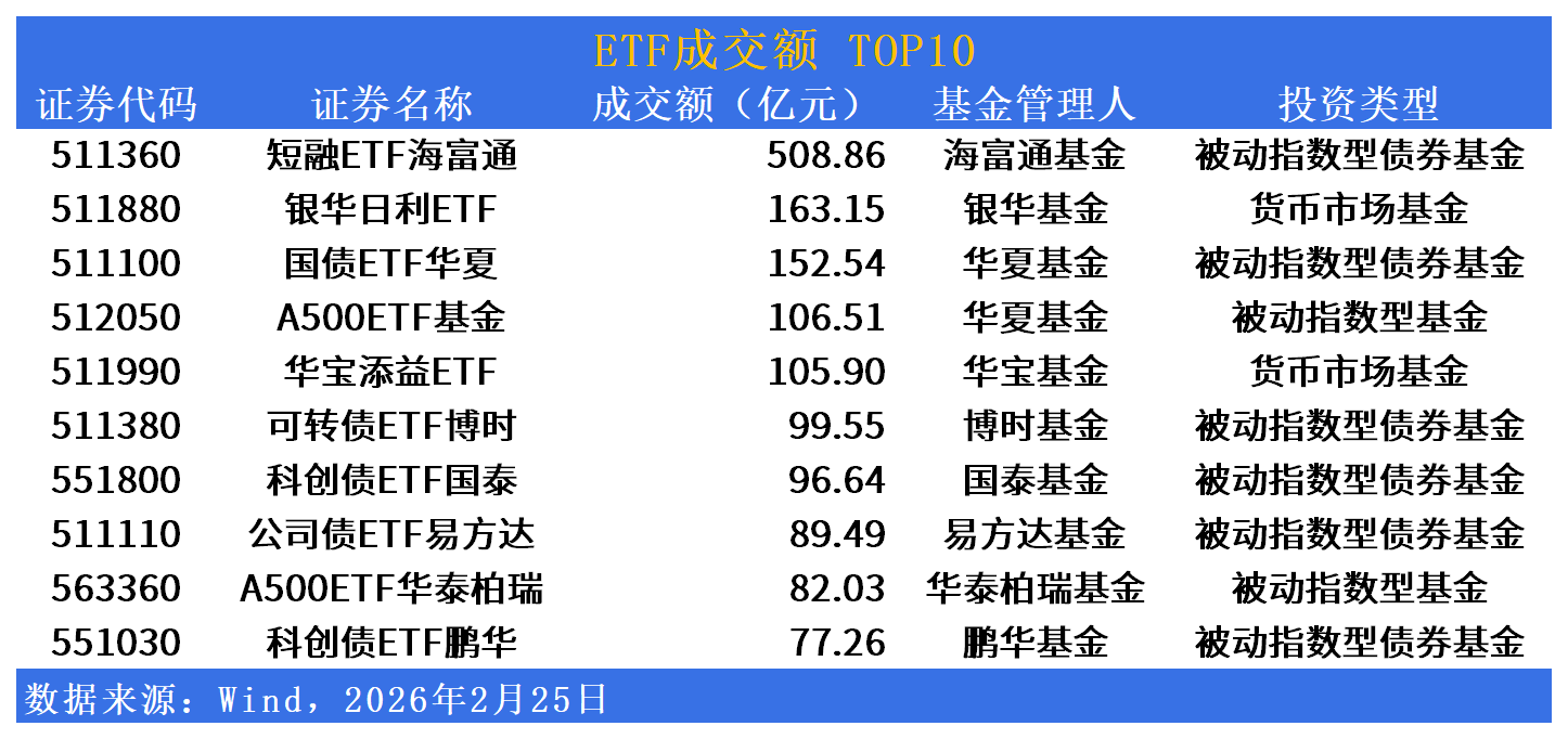 债券型ETF继续主导流动性榜单,短融ETF海富通(511360)单日成交额508.86亿元稳居第一;银华日利ETF(511880)、国债ETF华夏(511100)成交均超150亿元,A500ETF基金(512050)、华宝添益ETF(511990)成交破百亿。