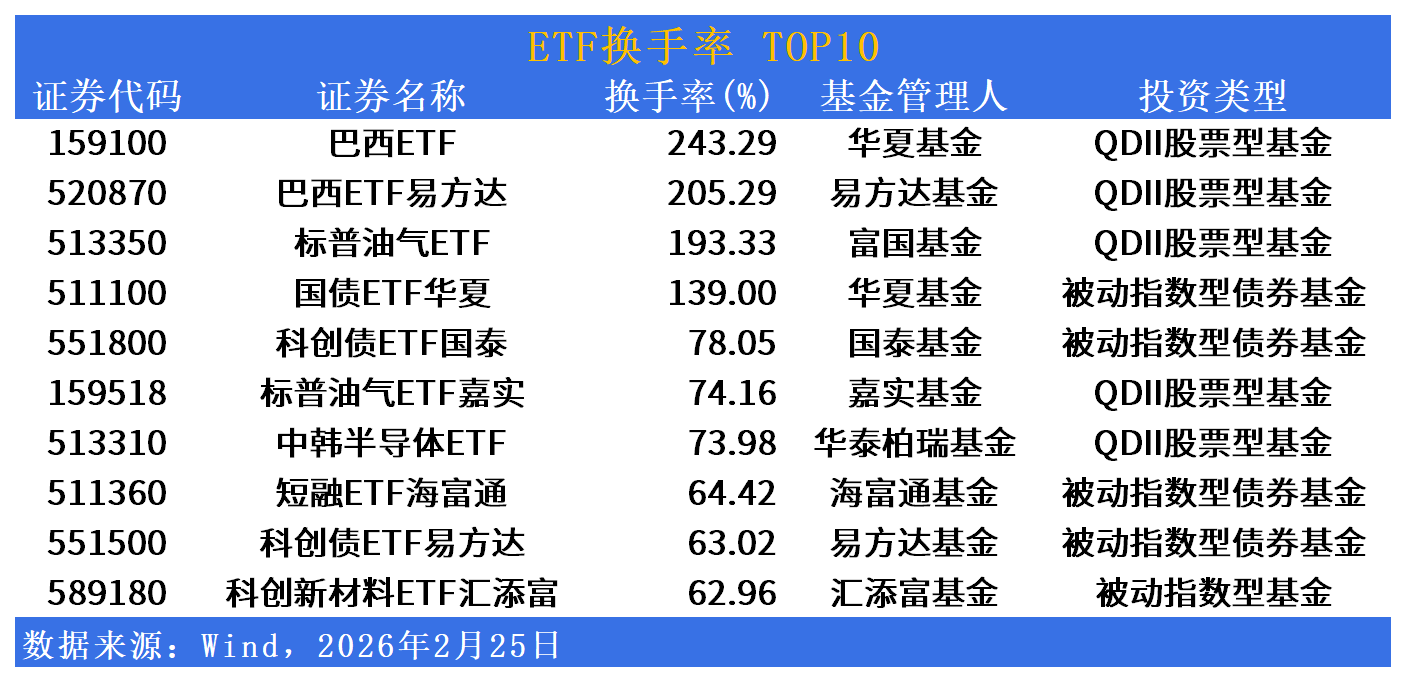 换手率方面,跨境产品交投极度活跃,巴西ETF(159100)换手率243.29%,巴西ETF易方达(520870)换手率205.29%,标普油气ETF(513350)换手率193.33%;国债ETF华夏(511100)换手率139%,科创债ETF国泰(551800)换手率78.05%,显示资金在利率债与跨境资产间快速切换。