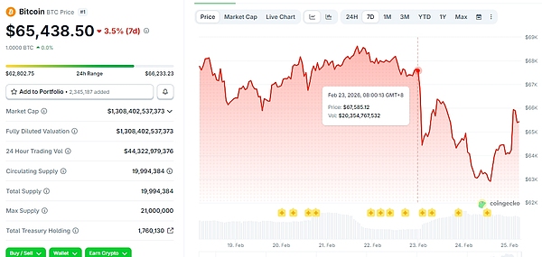 BTC价格从6.75万美元下跌至6.3万美元的近期低点。截至发稿有所反弹,报65438.50美元,仍不及AI担忧爆发以前的行情,7日跌幅3.5%。