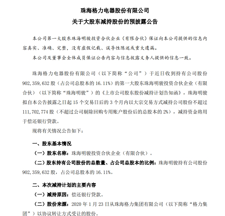 2月25日晚间,格力电器突然一纸公告称,第一大股东珠海明骏拟自公告披露之日起15个交易日后的3个月内,以大宗交易方式减持公司股份不超过11170.28万股,占公司剔除回购专用账户股份后的总股本的2%。至于此次减持原因,珠海明骏表示是为偿还银行贷款。