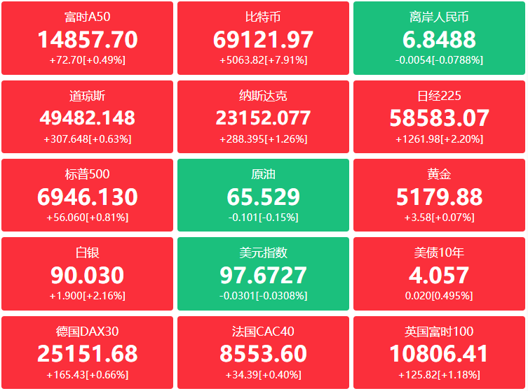 外盘:人工智能颠覆某些行业的担忧持续缓解,且投资者聚焦英伟达等企业财报数据,美股全线收涨,其中道指涨307.65点,涨幅0.63%报49482.15点;纳指涨288.40点,涨幅1.26%报23152.08点;标普500涨56.06点,涨幅0.81%报6946.13点;大型科技股全线上涨,奈飞涨约6%,微软、Meta涨超2%,英伟达、英特尔、特斯拉、亚马逊涨超1%;加密货币概念股普涨,Circle涨超35%,Coinbase涨超13%,BMNR涨超10%,Strategy涨超8%,Robinhood涨超5%;CME集团收跌3.7%创去年5月份以来最大单日跌幅;中概股龙头指数收跌0.28%,万物新生涨超8%,涂鸦智能、富途控股等涨逾5%,向上融科涨超3%,贝壳、亚朵集团等涨超2%;AHG跌10%,玉柴国际跌超9%,新东方、阿特斯太阳能跌超5%,百济神州、NEGG跌超4%,联电、汽车之家跌超3%。
