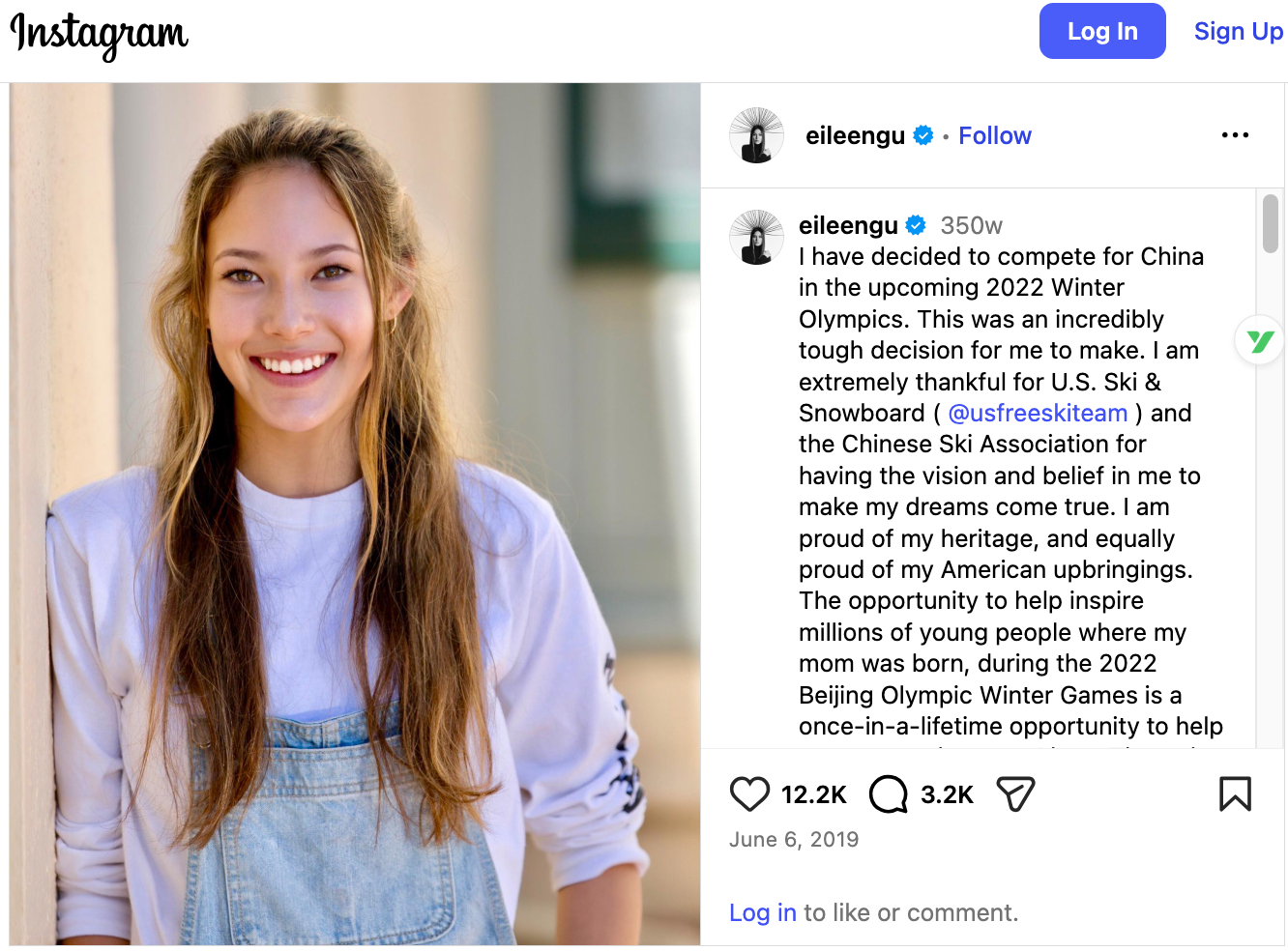 根据谷爱凌自己2019年6月的一个Instagram贴(上图),代表中国队参加奥运会是她自己的一个选择。所谓选择,就是她可以代表美国队,也可以代表中国队。而根据奥运会的规定,要代表某国参赛,必须拥有该国国籍。所以,她肯定有中国国籍。但她也肯定曾经有美国国籍。据说没有她放弃美国国籍的记录,所以,她应该是同时有双重国籍。