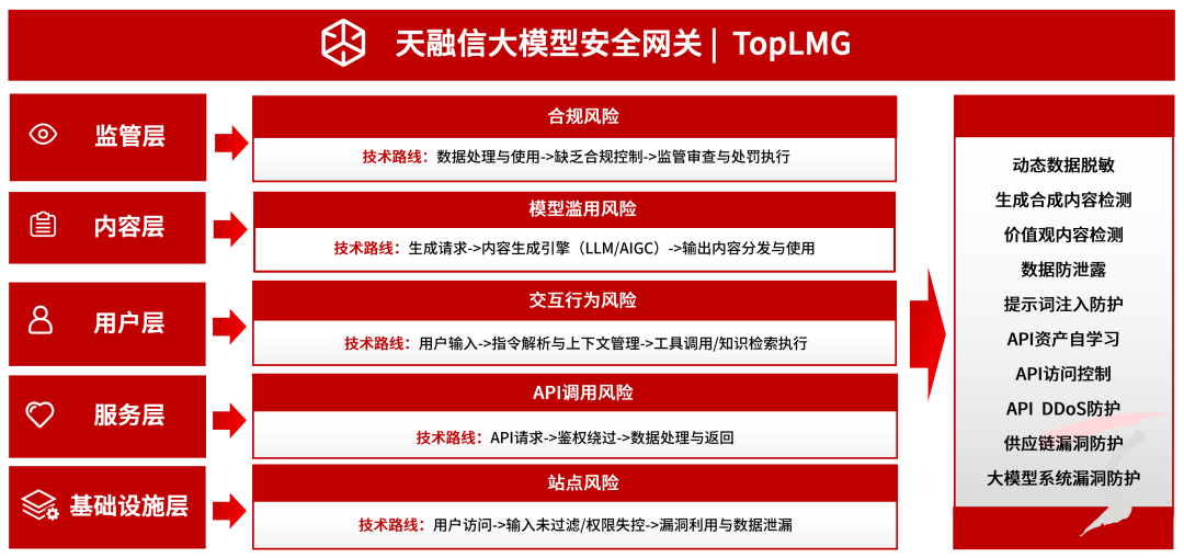 面对数据、模型、算法等层面的全新安全挑战,传统的安全工具、防护经验与应对策略难以适配新的应用场景。天融信大模型安全网关(TopLMG)紧密契合市场需求,迎来全面技术升级,以硬核能力构建全链路安全防护体系,形成“识别–保护–检测–响应–恢复”的智能防御闭环,护航大模型全生命周期安全。