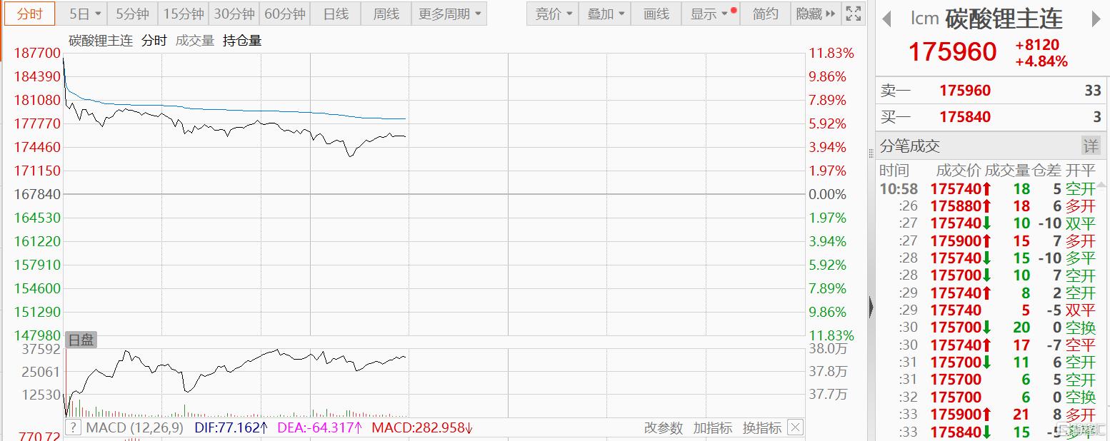 今日,碳酸锂连续主力合约强势上攻,昨日冲上17万元/吨关口,今日涨4.84%报175960元/吨。