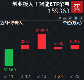 或由于英伟达最新财报大超市场预期,今日(2月26日)重仓光模块龙头的创业板人工智能ETF(159363)场内价格逆市拉升2.39%,早有资金提前进场埋伏,数据显示,此前4日该ETF连续吸金5.32亿元